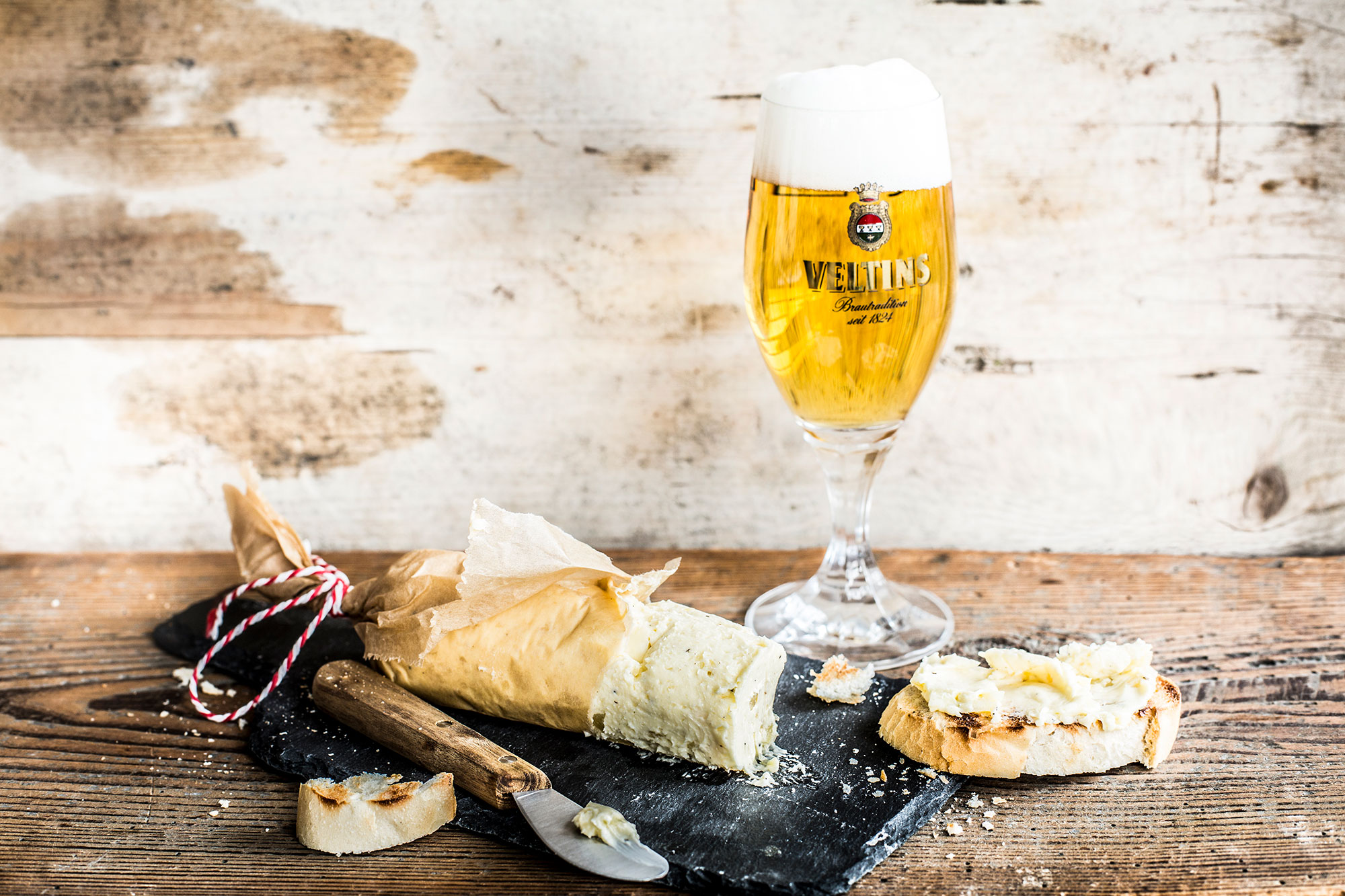 Die Knoblauchzehen schälen und durch eine Presse drücken. Mit Butter, frischem VELTINS und Senf verrühren, am besten mit einem Mixgerät. Mit Salz und Pfeffer abschmecken und etwa 15 Minuten ruhen lassen.