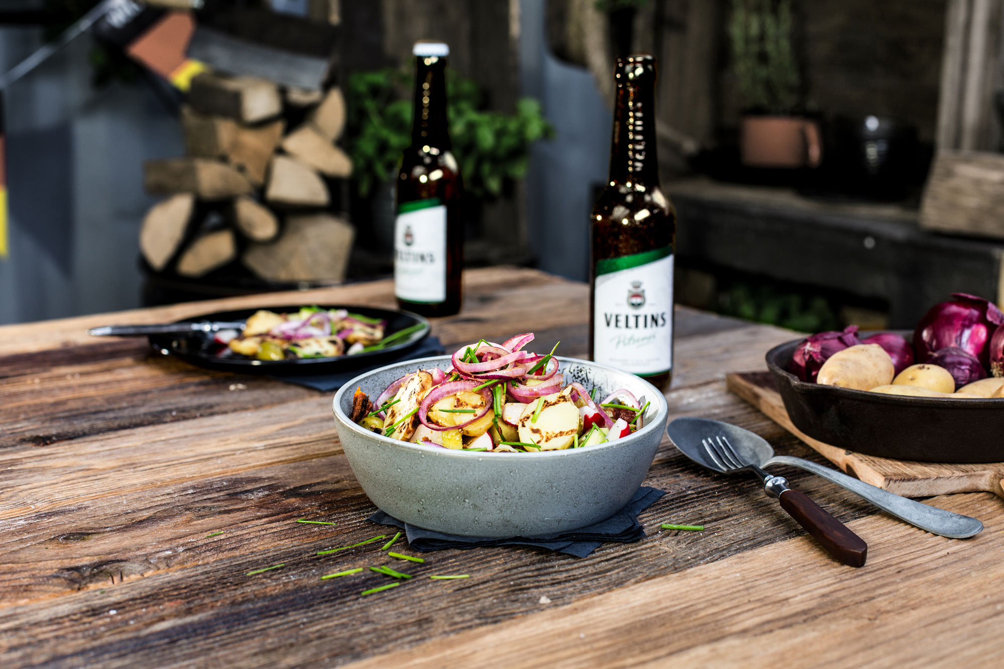In der Zwischenzeit Zwiebel schälen und in feine Ringe schneiden. Für das Dressing frisches VELTINS, Balsamico und Senf verrühren und mit Salz und Pfeffer würzen.