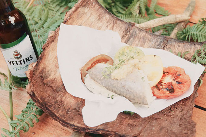 Sauerländer Saibling gefüllt mit Miso und Basilikum, gegart in Brennnesseln, Moos und frischem Veltins