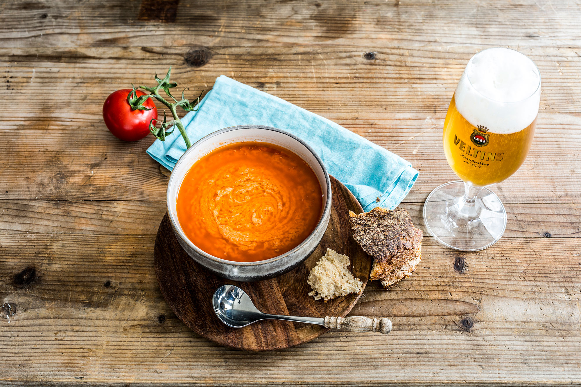 Tomaten und Brötchen in grobe Würfel schneiden und in einen Mixer geben. Knoblauch, Salz, Chili, Paprika, Kümmel, Petersilie, frisches VELTINS und Essig dazu geben und alles fein mixen. Bei Bedarf noch etwas mehr frisches VELTINS dazu geben, um die Sauce flüssiger zu machen. Mit dem Öl auffüllen, gut durchrühren und bei Bedarf nachwürzen.